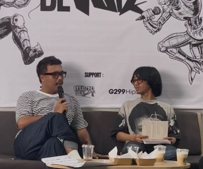 Denboi (sebelah kanan foto) dan Delpi (sebelah kiri foto) saat di diskusi soal ekosistem musik di Karawang.