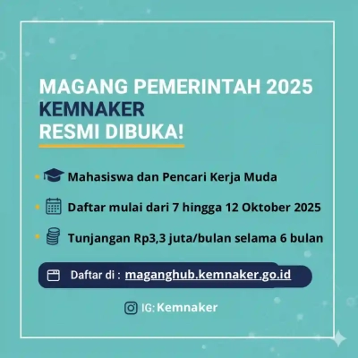 JAKARTA, LENSAIND.COM – Kementerian Ketenagakerjaan (Kemnaker) telah resmi membuka pendaftaran Program Magang Pemerintah 2025 yang menargetkan mahasiswa tingkat akhir dan lulusan muda di seluruh Indonesia. Pendaftaran program ini dibuka singkat, yakni mulai 7 hingga 12 Oktober 2025, melalui portal resmi Kemnaker.