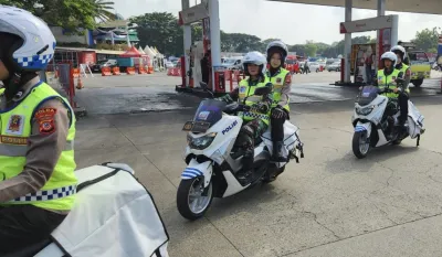 Tim motor senyum saat patroli di rest area.